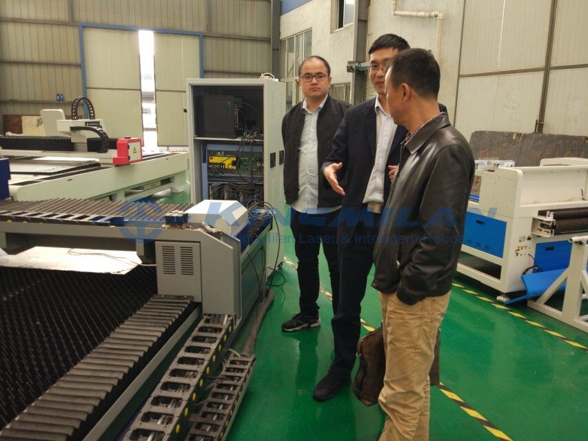 上圖,客商了解金米蘭中大功率激光切割設備! 參觀光纖激光切割機車間;