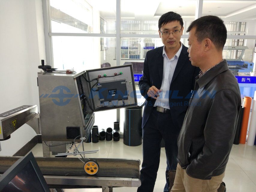 上圖,客商仔細了解高端激光噴碼機性能;